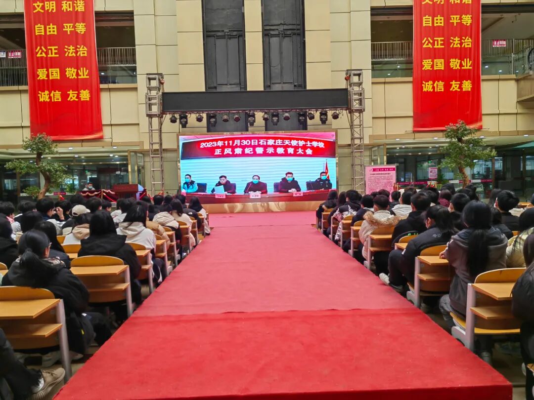 为强化师生纪律观念,大力整治校园风气,营造良好的校园秩序和学习生活环境,2023年11月30日,石家庄天使护士学校召开本年度第四次正风肃纪警示教育大会。